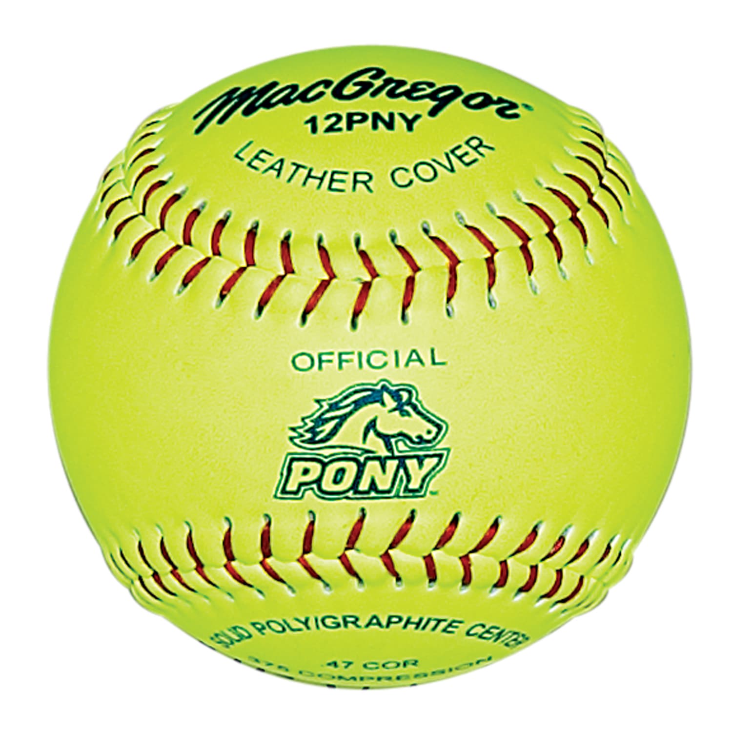 Get the MacGregor® Pony® Approved 12" Softball this season. Your team is sure to turn in a performance reflecting that they know they're playing with the best. Ball has an optic yellow cover for better visibility; cover has been redesigned for better grip. Red seams with a poly graphite center. This Pony* league approved softball has COR. 47/375 lb. max comp.