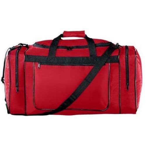 Augusta Gear Bag 420-denier nylon with PVC coating. Zippered main compartment has large U-shaped opening with two zipper pulls. Separate zippered compartments at each end. Black web handles with self-fabric handle wrapper reinforced at stress points. Adjustable and detachable shoulder strap. Plastic hardware. Piping trim for durability. Removable inside bottom board. 22"W x 11"H x 11"D.