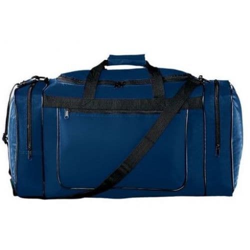 Augusta Gear Bag 420-denier nylon with PVC coating. Zippered main compartment has large U-shaped opening with two zipper pulls. Separate zippered compartments at each end. Black web handles with self-fabric handle wrapper reinforced at stress points. Adjustable and detachable shoulder strap. Plastic hardware. Piping trim for durability. Removable inside bottom board. 22"W x 11"H x 11"D.