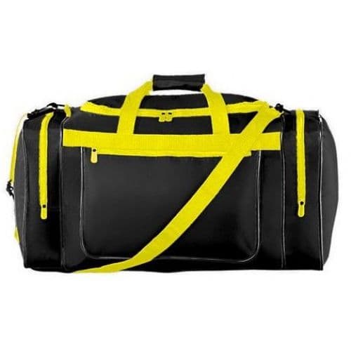 Augusta Gear Bag 420-denier nylon with PVC coating. Zippered main compartment has large U-shaped opening with two zipper pulls. Separate zippered compartments at each end. Black web handles with self-fabric handle wrapper reinforced at stress points. Adjustable and detachable shoulder strap. Plastic hardware. Piping trim for durability. Removable inside bottom board. 22"W x 11"H x 11"D.