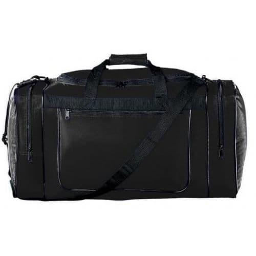 Augusta Gear Bag 420-denier nylon with PVC coating. Zippered main compartment has large U-shaped opening with two zipper pulls. Separate zippered compartments at each end. Black web handles with self-fabric handle wrapper reinforced at stress points. Adjustable and detachable shoulder strap. Plastic hardware. Piping trim for durability. Removable inside bottom board. 22"W x 11"H x 11"D.