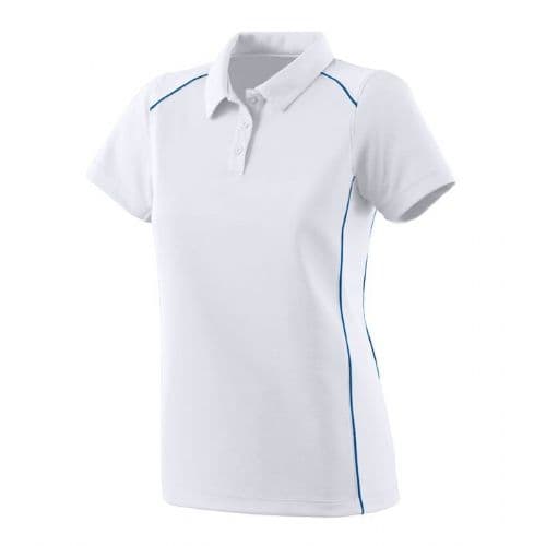 Augusta Ladies' Winning Streak Polo 4.4 ounce 100% polyester wicking closed hole mesh. 4.1 ounce 100% polyester pinhole micromesh shoulders and side panels. Wicks moisture. Tagless label. Self-fabric collar. Ladies' fit. Box-stitched placket. Three matching buttons with cross-stitching. Contrast color piping. Set-in sleeves.