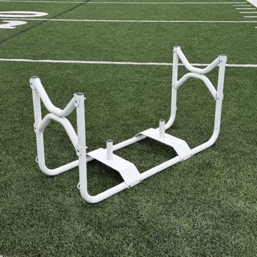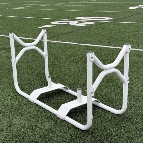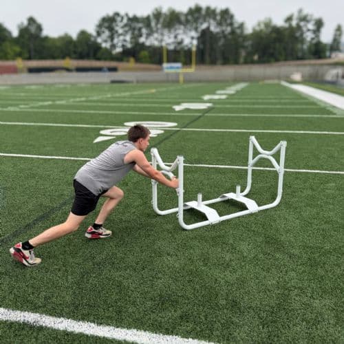 - Drive 1 or 2 handed (hold a football or med ball while pushing).