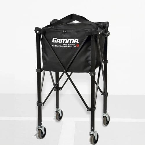 The GAMMA EZ Travel Cart PRO XD 250 is a light duty cart designed to roll on tennis courts, pickleball courts and other smooth surfaces. The EZ Travel Cart PRO XD 250 is much larger than the EZ Travel Cart 150 as it is designed to carry 250 balls. This fantastic product features the same durable nylon ball bag that clips securely into the top of the cart, a patented cross brace support under the ball bag and durable swivel rubber wheels (two locking wheels). The EZ Travel Cart PRO compresses and stores in its own carrying case in under 15 seconds- from car to court in a flash!