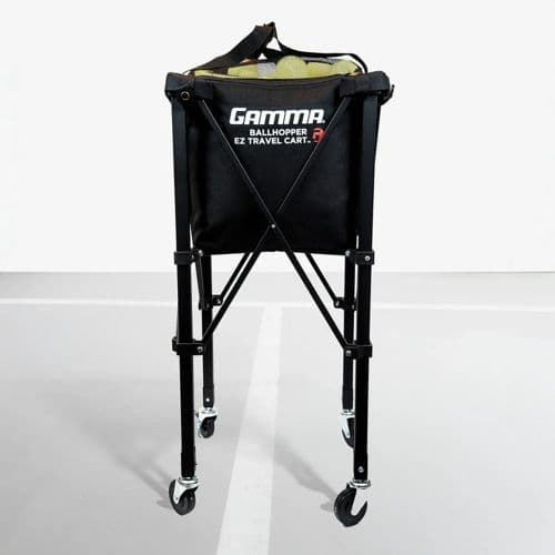 Gamma EZ Travel Cart™ XD Meet your new Ballhopper! The GAMMA EZ Travel Cart™ XD is a light-duty Ballhopper cart used to easily transport your balls across the court. Featuring a new and improved extra duty wheel assembly designed with added reinforced aluminum sleeves at the base of each leg for extra strength and greater durability around the wheel insert. The EZ Travel Cart™ features a durable nylon ball bag that clips securely into the top of the cart. It also features a patented cross brace support under the ball bag, and durable swivel rubber wheels (two locking wheels). The EZ Travel Cart compresses and stores in its own carrying case in under 15 seconds. It can also be removed from the cart and used as a stand-alone bag. The EZ Travel Cart™ is the ultimate portable teaching cart!