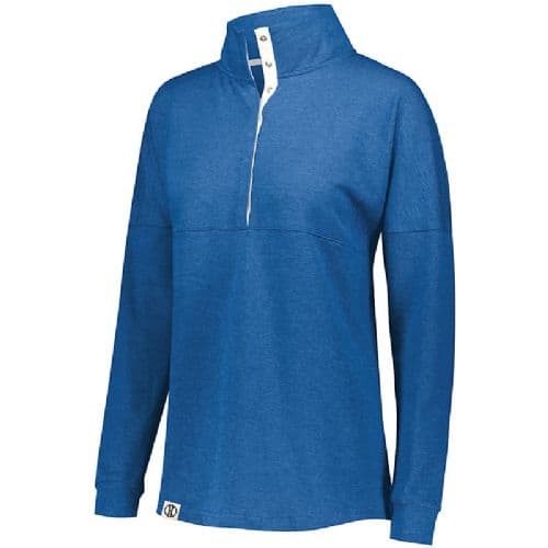 Holloway Ladies' Sophomore Pullover 7.8 ounce, 50% polyester/50% cotton French terry knit with vintage heathered look for worn-in feel. Ladies' fit. Fits loose to body. Exterior woven logo loop label. Natural twill accents at neck and placket. Dropped shoulder sleeves for mobility and comfort.