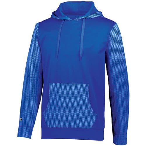 Holloway Men's Range Hoodie Dry-Excel™ 100% Polyester performance wicking fleece features tonal tech weave print on hood, sleeves and pocket. Roller printed to reduce chance of dye migration. Wicks moisture. Pad print label. Pinhole mesh lined hood with thick drawcord and metal eyelets on Adult sizes only. Set-in sleeves. Front pouch pocket. Self-fabric cuffs and bottom band.