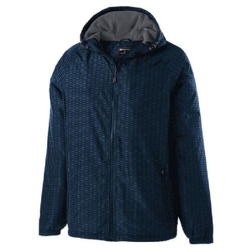 Holloway Youth Range Jacket Tech weave printed Micron lightweight Polyester. Omni-Sof microfleece lined body and hood. Taffeta lined sleeves. Woven label. Contrast color shiny coated front zipper with reflective zipper pull and matte tips. Adjustable 3 piece hood with eyelets and concealed cord locks on Adult sizes only. Raglan sleeves for maximum mobility. Contrast color shiny coated front pockets with black pull cord. Interior all access decoration zipper. Inside zippered valuables pocket. Half-elastic cuffs. Dropped tail. Water-resistant.