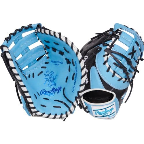 HOTH 1ST BASE MITT 12.5" - COL. BLUE RHT Scoop 'em all with the 13-inch Heart of the Hide first base mitt, a beautiful glove with a Columbia blue and black colorway. Additionally, the columbia blue on white Rawlings patch and columbia blue Oval-R are a nice touch to add some flare to the mitt. This mitt sports an DCT pattern, which helps ensure a secure squeeze. The pattern is paired with a single-post, double-bar web, great for creating a deep pocket to swallow every ball in your direction. The ultra-premium, world-renowned Heart of the Hide leather will give you pro-level glove performance that can last for years. Grab your Rawlings 13-inch Heart of the Hide first base mitt today!