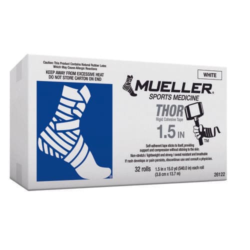 Mueller® Thor® Tape 1.5 in x 15 Yd, 32 Rolls THOR® Rigid Cohesive Tape offers the superior control and easy manipulation athletic trainers need. Use it with Mueller Tapewrap® Premium to create strong heel locks, precise figure-8s, and superb seating of strips.