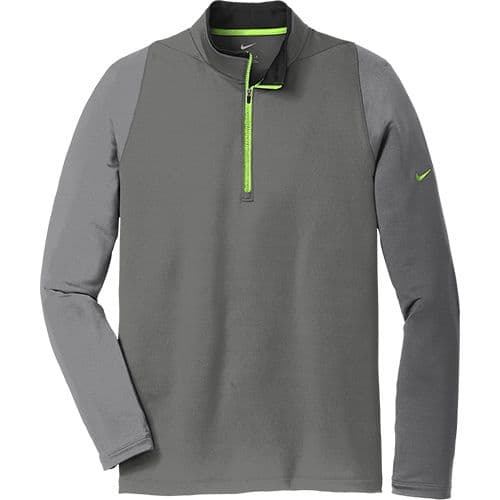 Nike Men's Dri-FIT Stretch 1/2-Zip Pullover Built for the course, gym or just around town, this cover-up performs with comfortable stretch for uninhibited movement and Dri-FIT moisture management technology for exceptional cooling. The design includes a contrast collar and zipper, open cuffs and an open hem. The contrast Swoosh design trademark is embroidered on the upper left sleeve. Made of 7.6-ounce, 93/7 polyester/spandex Dri-FIT fabric.