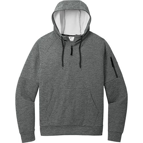 Nike Men's Therma-FIT Pocket 1/4-Zip Fleece Hoodie This 1/4-zip hoodie with a zippered left arm pocket brings the heat to your workout with Therma-FIT fabric. Therma-FIT helps manage your body’s natural heat to keep warm in cold-weather conditions. The design includes a three-panel hood with black drawcords, a dyed-to-match zipper and a front pouch pocket. Self-fabric cuffs and hem. A contrast Swoosh logo is embroidered on left sleeve. A contrast Therma-FIT logo is embroidered on back hem. Made of 7.4-ounce polyester Therma-FIT fabric.