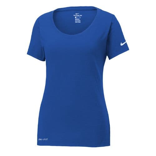 Nike Women's Dri-FIT Cotton Blend Scoop Neck Tee This Nike performance tee features sweat-wicking fabric to help keep you dry and comfortable. Durable rib knit scoop neck. Heat transfer label for tag-free comfort. Double-needle stitching throughout. Contrast heat transfer Swoosh design trademark on left sleeve. Contrast heat transfer Dri-FIT logo at right hem. Made of 4.7-ounce, 60/40 cotton/polyester Dri-FIT fabric.
