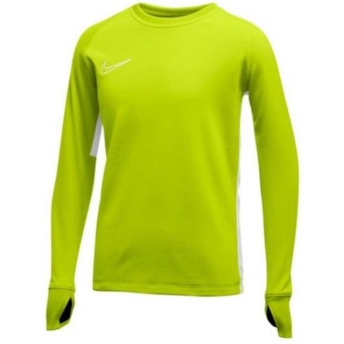 Nike Youth Academy19 Crew Top Dri-FIT technology helps you stay dry, comfortable and focused. Brushed fabric provides a warm, comfortable feel. Mesh side stripes add breathability. Thumb loops help keep your hands covered. Ribbed collar and cuffs help keep warmth in. Outline Swoosh design trademark is embroidered. 100% Polyester.