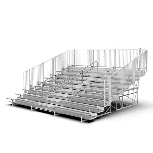 • 2" x 10" anodized aluminum seat planks (no discoloring) • 2 - 2" x 10" Foot Planks on every row • Risers on every row • Choice of Standard Fence Railing or Vertical Picket Railing on all models • 4.5' Aisle with aluminum hand rail