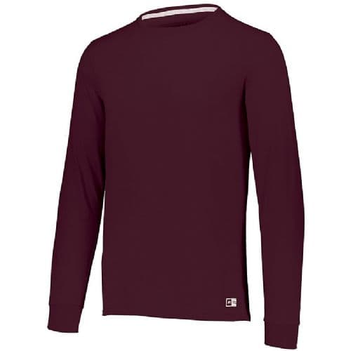 Russell Athletic Essential Long Sleeve Tee The Russell Athletic® Essential Long Sleeve Tee delivers the comfort, style, and performance to fit your active lifestyle. This long sleeve crewneck T-shirt will keep you dry as you sweat, making it easy to transition from work to workout. 4.75 ounce. 60% cotton/40% polyester. Oxford: Oxford 47% cotton & 53% polyester. Dri-Power® Moisture Wicking Technology. Odor protection. Pad print label. RUSSELL ATHLETIC heat sealed label on bottom left front. Crew neck. UPF 30+, provides protection from the sun. Set-in sleeves.