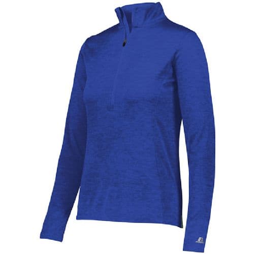 Russell Athletic Ladies' Dri-Power Lightweight 1/4 Zip Pullover Bring comfort to your workout with the Russell Athletic® Ladies Dri-Power Lightweight ¼ Zip Pullover. The 100% polyester, heathered construction features moisture-wicking technology to keep you dry and light, odor protection to keep you fresh, while stretch fabric provides a greater range of motion. This ¼ zip will keep you feeling comfortable and looking stylish 100% polyester 2-tone interlock. Dri-Power® Moisture Wicking Technology. Odor protection. 4-Way stretch technology. Ladies' fit. Tagless label. "R RUSSELL" on left sleeve end. Quarter zip pullover style with zipper garage. Set-in sleeves . Open bottom.