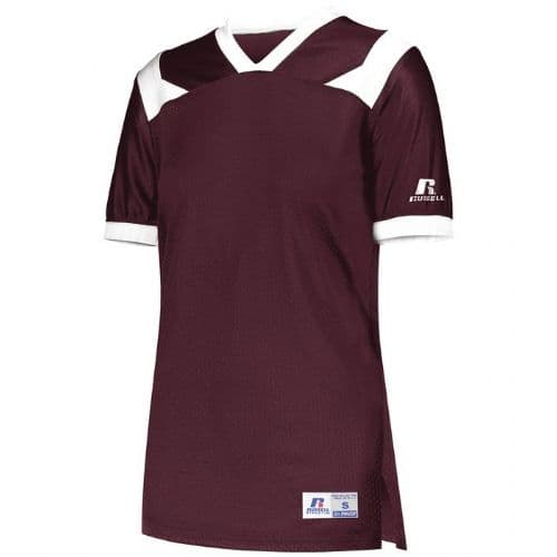 Russell Athletic Ladies' Phenom6 Flag Football Jersey 100% nylon (colors), 100% polyester tricot mesh (white). 73 cloth yoke for added durability in contact area. 62 cloth side inserts for tailored fit. Ladies' Fit. Outside locker label. V-neck collar. Side vents. Not to be worn with pads. Contrast color inserts. Set-in sleeves.