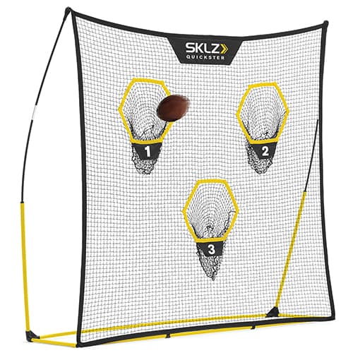 The SKLZ Quickster QB Trainer is an ultra-portable passing trainer that perfects accuracy to key receiving areas. With a new frame design and ultra-durable triple-gusset reinforced corner joints, the Quickster QB Trainer is built to withstand high-intensity training. Easily improve passing accuracy with three high visibility numbered targets that are positioned in key receiving areas.