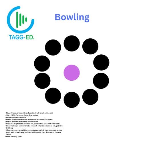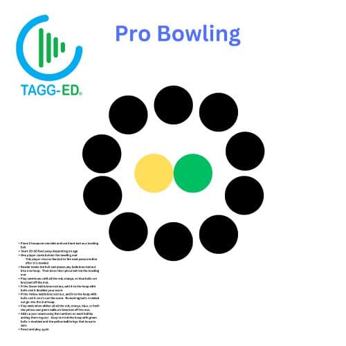 Players use their bowling skills to knock TAGG-ED® balls off the TAGG-ED® bowling mats and try to collect the highest score possible. But theres a catch with the PRO version. Knock off the Yellow ball and your score goes to zero, but knock off the green ball and double your score! TAGG-ED® Bowling mats are 36 x 36 and printed on durable vinyl for many years of use. Designed to be used in connection with the TAGG-ED® balls to promote learning math skills through active play. The TAGG-ED® Bowling mat is designed for grades K-2 while the TAGG-ED® Pro Bowling mat is designed for grades 3+. Each TAGG-ED® bowling mat has the instructions and scoring printed on the mat.