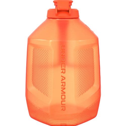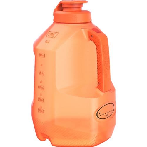 UA 1 GALLON SIDELINE JUG Leak-proof 2-way cap with smooth spout design,Wide mouth top design for easy cleaning, adding ice and supplements,Durable, semitransparent outer body with molded exterior markings listed in oz / ml for easy measuring,Soft molded handle with stainless steel pins for secure and comfortable grip,Grips on body make it just as easy to hold the jug body with one hand,Impact resistant base with flex channels add durability,Air gaps on bottom reduce heat generation, keeping fluids cooler,Customizable UA Locker Tag