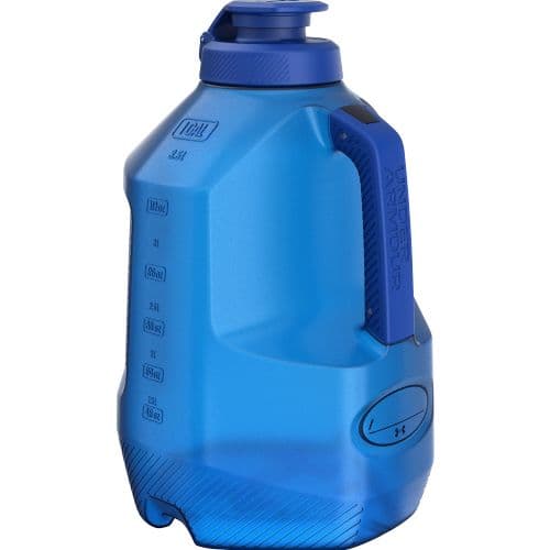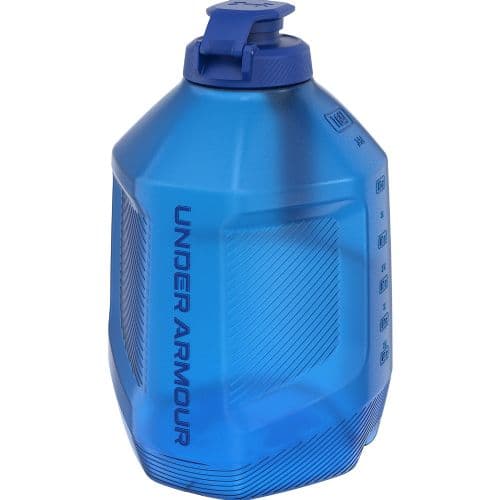 UA 1 GALLON SIDELINE JUG Leak-proof 2-way cap with smooth spout design,Wide mouth top design for easy cleaning, adding ice and supplements,Durable, semitransparent outer body with molded exterior markings listed in oz / ml for easy measuring,Soft molded handle with stainless steel pins for secure and comfortable grip,Grips on body make it just as easy to hold the jug body with one hand,Impact resistant base with flex channels add durability,Air gaps on bottom reduce heat generation, keeping fluids cooler,Customizable UA Locker Tag