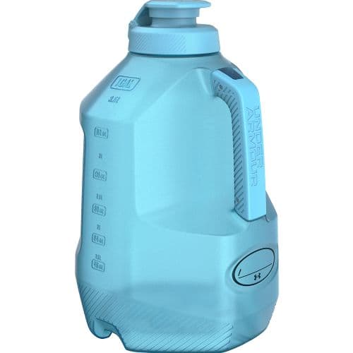 UA 1 GALLON SIDELINE JUG Leak-proof 2-way cap with smooth spout design,Wide mouth top design for easy cleaning, adding ice and supplements,Durable, semitransparent outer body with molded exterior markings listed in oz / ml for easy measuring,Soft molded handle with stainless steel pins for secure and comfortable grip,Grips on body make it just as easy to hold the jug body with one hand,Impact resistant base with flex channels add durability,Air gaps on bottom reduce heat generation, keeping fluids cooler,Customizable UA Locker Tag